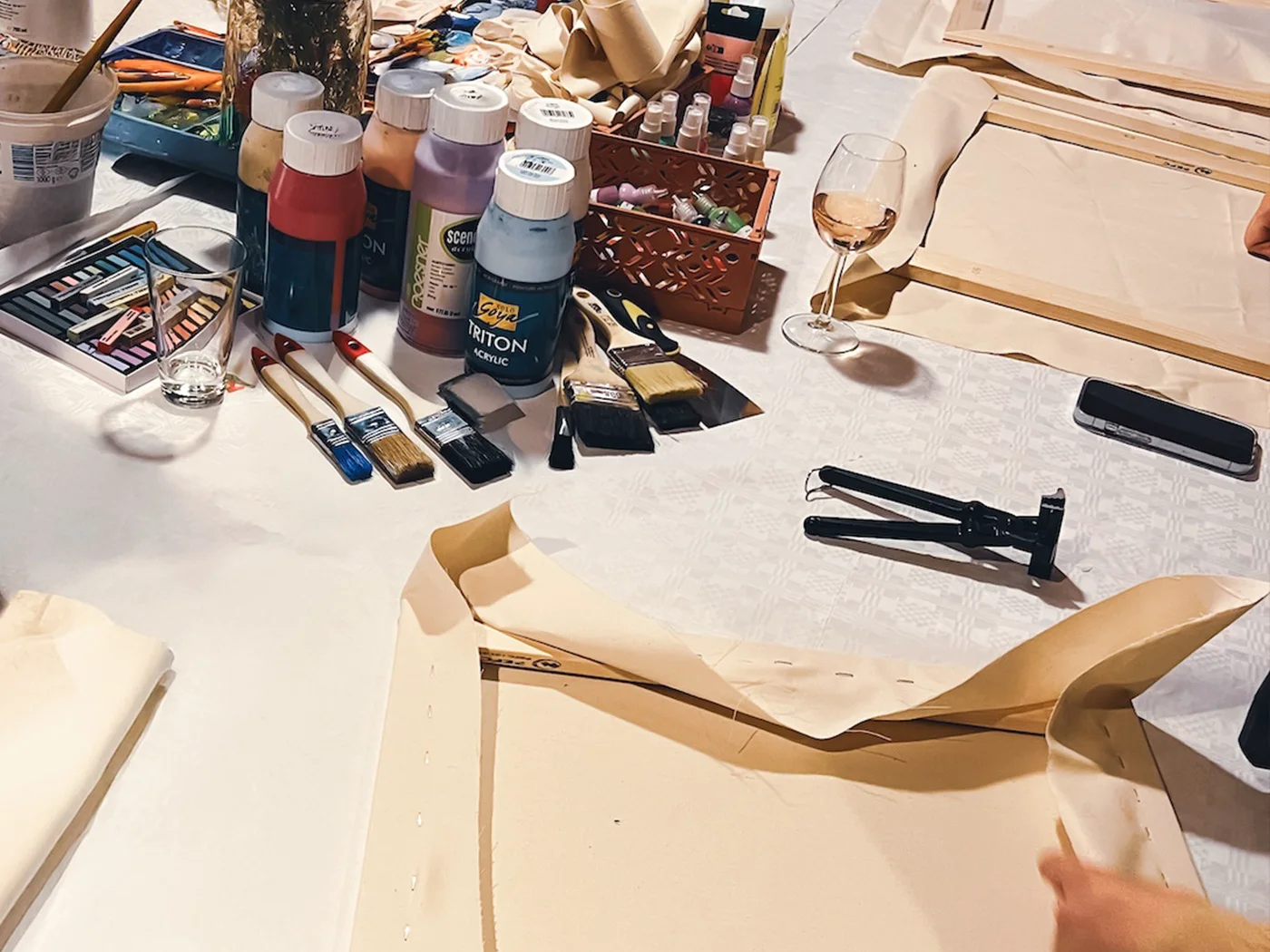 Gemeinsam bespannen wir dann unsere Leinwände mit hochwertigem Leinenstoff.